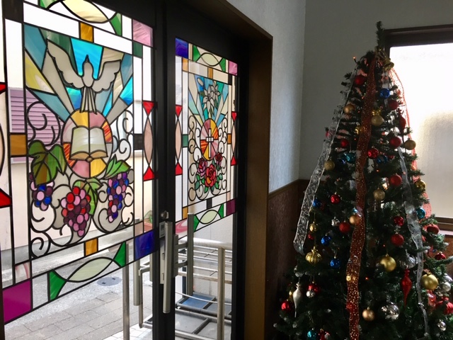 今年の桑名キリスト教会のクリスマスは、12月5日(木)のアドベント祝会からスタートしました。屋外の壁には、牧師夫妻が自然素材から作った大きなリース、玄関内には毎年のごとく ツリーが飾られて お客様を出迎えます。