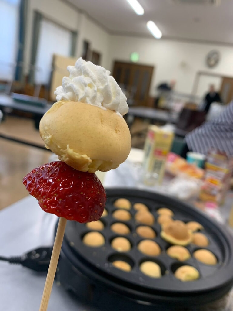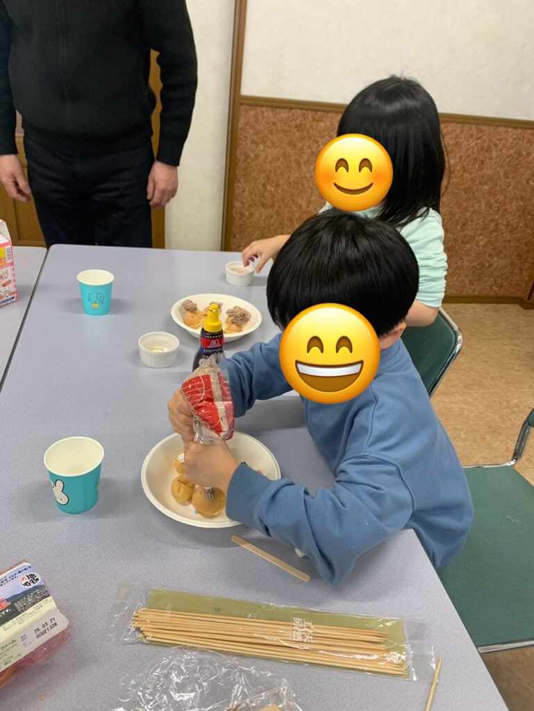 オヤツは、たこ焼き機にホットケーキミックスを溶いたものを流し込み、生クリームをトッピングしたりと子供たちの目の前でできていくワクワクタイムでした。