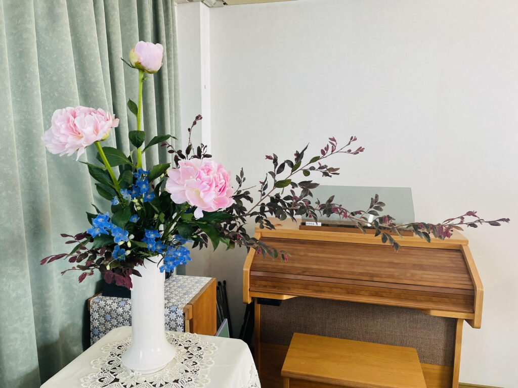 礼拝堂 講壇横 初夏の生け花をご紹介します。