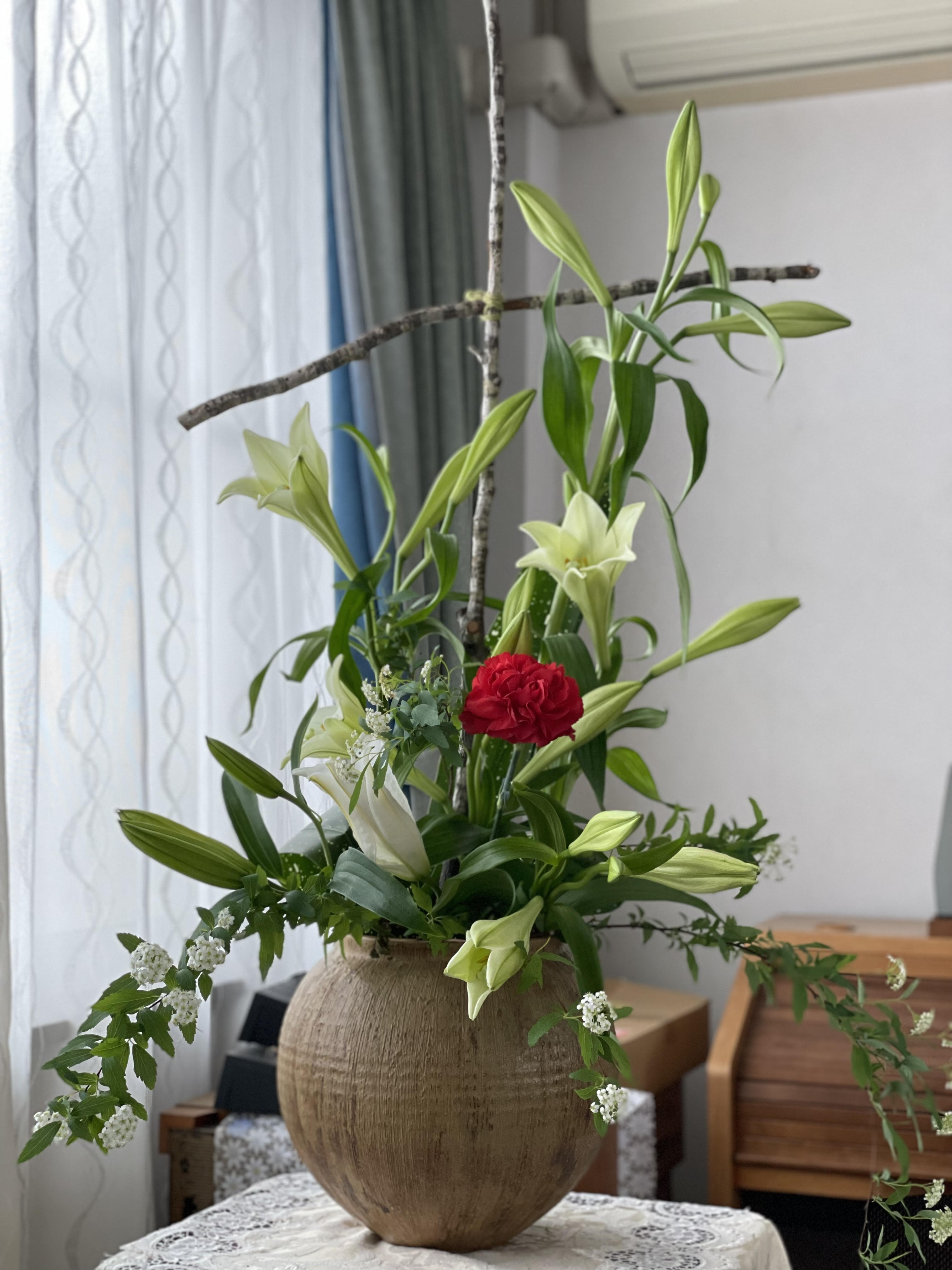 イースターの生け花 2022年4月17日撮影 P 2022年4月17日 K イベント報告, 写真館 ユリ、カーネーションなどを大胆に生けました 礼拝堂 講壇横 春の生け花をご紹介します。 本日令和4年(2022年)4月17日は、イエスキリストの復活を祝うイースター礼拝でした。当教会では、生花、看板の他に、過去に召天された兄弟姉妹のお写真を毎年飾っています。教会学校では、恒例のイースター野外礼拝に行き、公園の各所に隠されたイースターエッグ探しを楽しみました。 イエスさまの復活を祝うと同時に、信仰の先輩方を共に偲びました