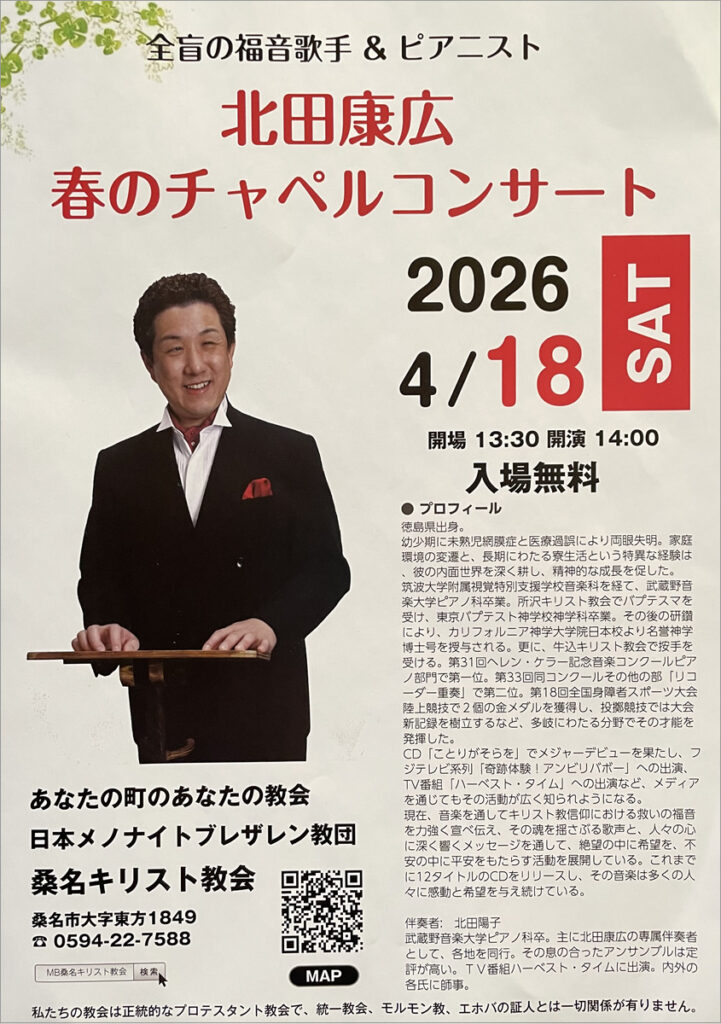 「全盲の福音歌手&ピアニスト 北田康弘 春のチャペルコンサート」